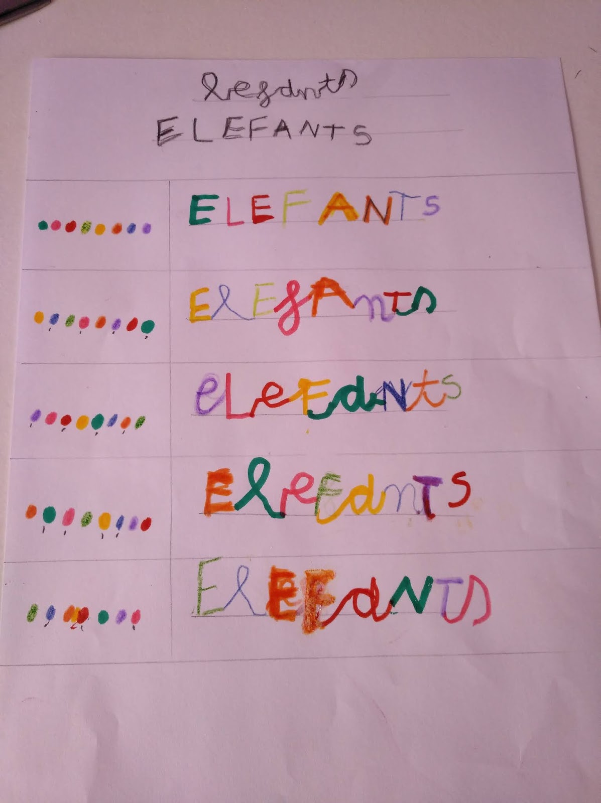 Giulia ha escrit el seu nom seguint el codi, ha completat els dibuixos mentre ordenava les lletres de l'abecedari i ha pintat el monstre de colors!